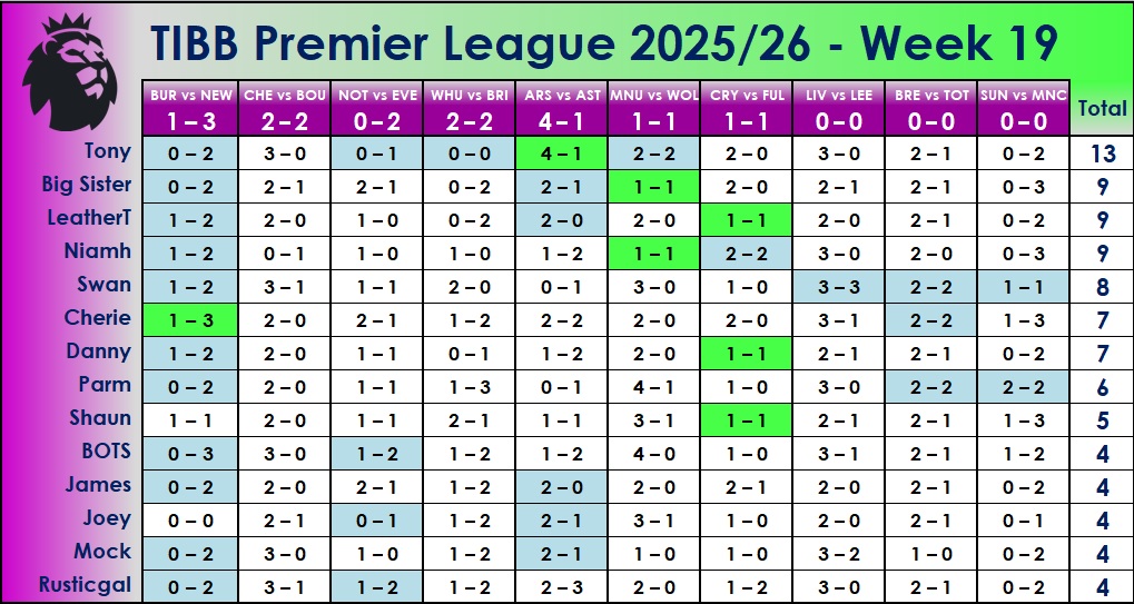 West Ham v Nottingham Forest 2-0 Wednesday 7th January Bournemouth v Tottenham 1-1 Brentford v Sunderland 2-0 Crystal Palace v Aston Villa 0-2 Everton v Wolves 1-2 Fulham v Chelsea 2-1 Manchester City v Brighton 3-0 Burnley v Manchester United 1-0 Newcastle v Leeds 0-1 Thursday 8th January. Arsenal v Liverpool 2-3