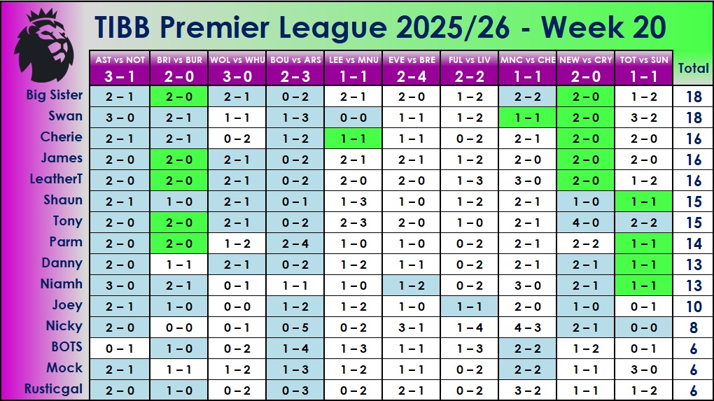 West Ham v Nottingham Forest 1-1 Wednesday 7th January Bournemouth v Tottenham 2-2 Brentford v Sunderland 1-1 Crystal Palace v Aston Villa 1-4 Everton v Wolves 2-1 Fulham v Chelsea 0-2 Manchester City v Brighton 3-1 Burnley v Manchester United 0-2 Newcastle v Leeds 2-1 Thursday 8th January. Arsenal v Liverpool 1-0
