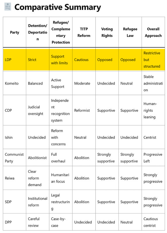 In responses to NGO surveys, the LDP took a cautious or neutral stance on revising the Technical Intern Training Program (TITP), granting local voting rights to permanent residents, and enacting anti-discrimination laws.