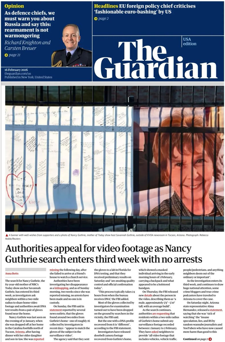 Authorities investigating Nancy Guthrie disappearance seal off road Authorities investigating the disappearance of US TV host Savannah Guthrie's mother sealed off a road near her home late on Friday night. A parade of cars from the FBI and the sheriff's office, including forensics vehicles, were seen passing through a roadblock set up about two miles from Nancy Guthrie's Arizona house. Blood from the 84-year-old was previously found on the Tucson-area property's front porch. She was reported missing on 1 February . Investigators have found several gloves, the nearest of which was discovered some two miles from Ms Guthrie's home, and submitted them for lab analysis, the sheriff's office said. The department said it had collected DNA from Ms Guthrie's property, which does not belong to the missing OAP, nor those in close contact with her. Supposed ransom notes have been sent to news outlets, but two deadlines for paying have passed. Police have said that she has difficulty walking, has a pacemaker, and requires daily medication for a heart condition. Sorting through such tips is a tremendous amount of work, said Roberto Villasenor, a former Tucson police chief. "In a situation like this, you really cannot do what's been done without tips and public input," he said. "They have processed the scene. But once that's done and exhausted, it's hard to move forward without additional information coming in." …they’ve sealed off the road but that still doesn’t read like a significant development has taken place…?…yesterday a white tent was erected and then taken down again…