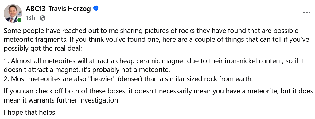 NASA released a graphic showing where meteorites would be found and approximate sizing. So now everyone is sending rock pics now "Is this ![]() The area where it dropped is somewhat local so I know the area well, but most looks like it is well-developed Residential, ie someone's back yard and shopping strips (particularly I-45):