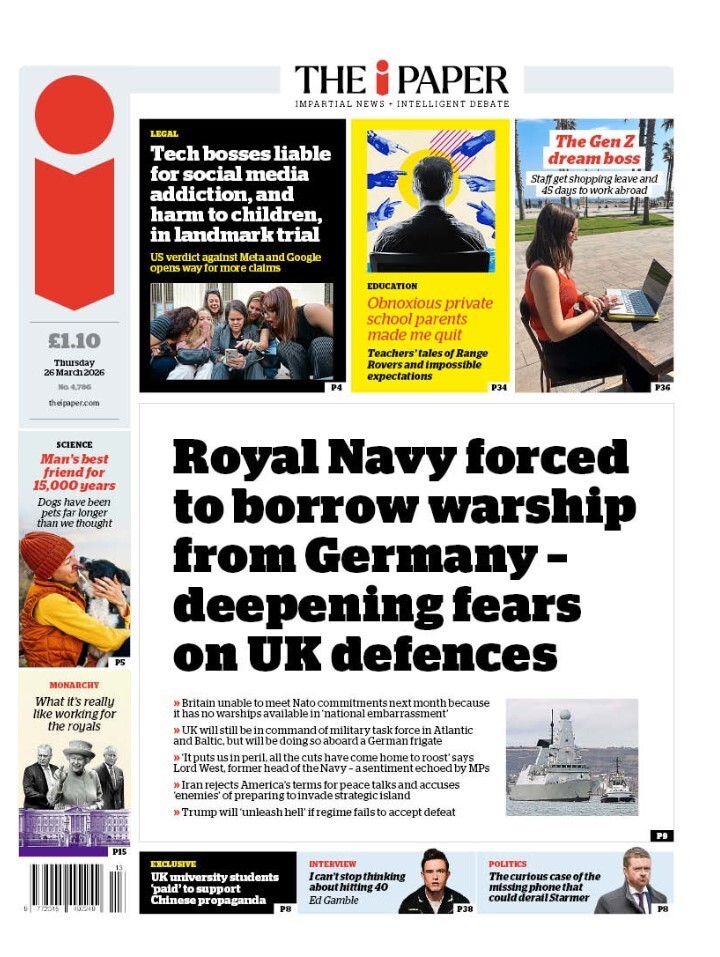 [The Royal Navy has been "forced to borrow" a warship from Germany, but will still lead a military task force in the Atlantic and Baltic, reports The i Paper. ]