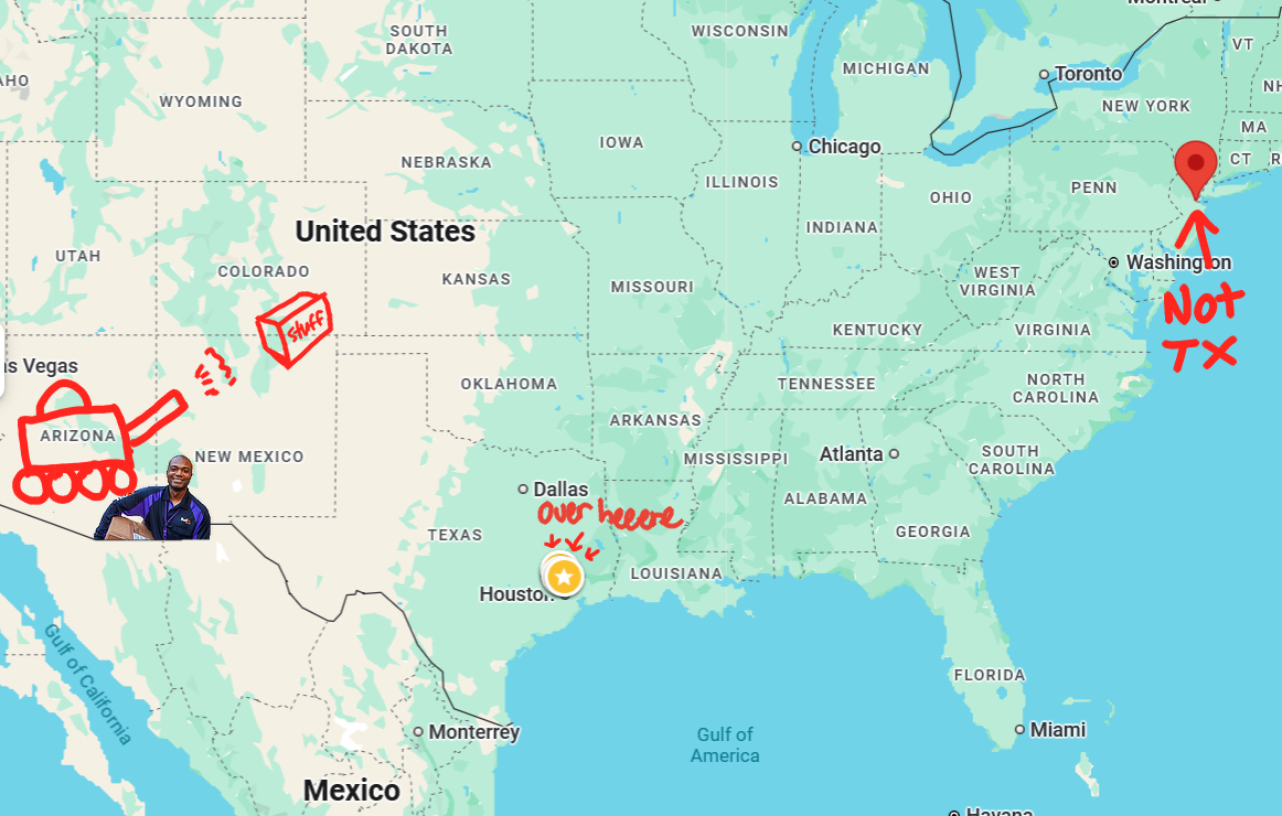 Fun story, but I ordered an embossing machine (for card) that's not time critical which is coming through Fedex. I checked tracking just now. It is meant to come TX from AZ and somehow how now is in NJ. Accurate map showing distressing logic: ![]() Now begins to the adventure of seeing if it's my turn for a package to accidentally go outside the country also because I have heard way too many stories of that happening to too many people I know.