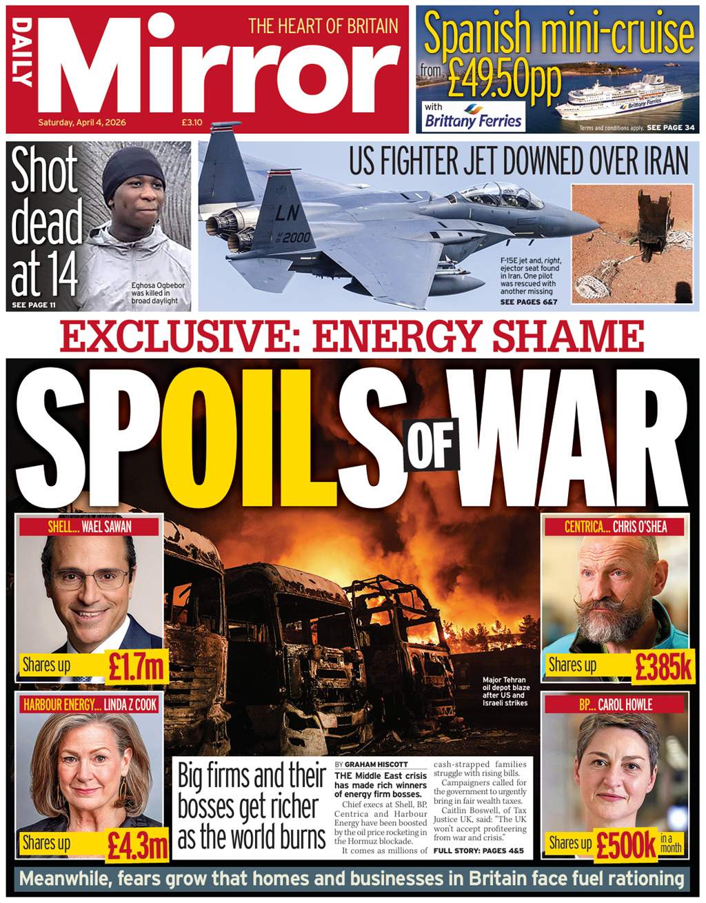 [Companies generating extra profits from rocketing energy prices because of the Iran war. It suggests there are growing fears that homes and businesses will face fuel rationing.]