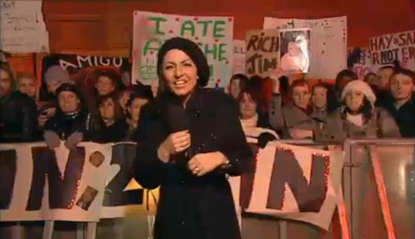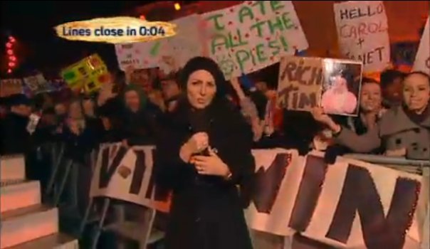 1. Davina stands near teh crowd when she is reading this stuff out I think... doesnt she stand where some of the journalists do, eg. when on BBLB Nikki was looking at people go in and she would make her comments like "Ohh he's fit" that onme time, doesnt she stand somewhere there because you cant see her when she's reading out?