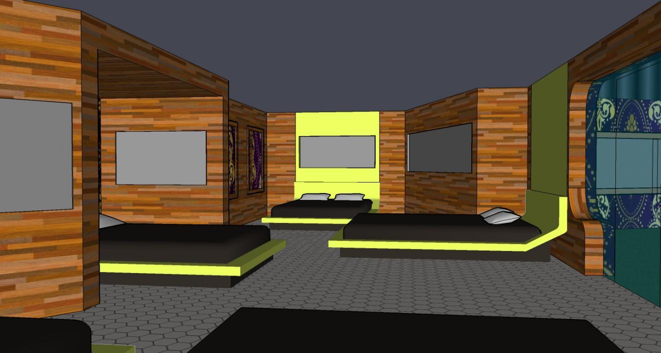 It's soooooo cool it's all kinda cold and stuff, it's looks like the housemates might be uncomfortable sleeping in there but thats good!!!!! nice shape to the room, cool colours too, it's well coool well done!