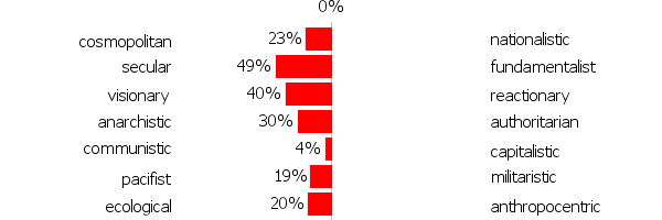 Oh it said I was a cosmopolitan Social Democrat, wouldn't have thought to describe myself as that but when I googled it I found a description from this guy saying it means "promoting the rule of law at the international level; greater transparency, accountability and democracy in global governance; a deeper commitment to social justice in the pursuit of a more equitable distribution of life chances; and the regulation of the global economy through the public management of global trade and financial flows", which I do sorta agree with