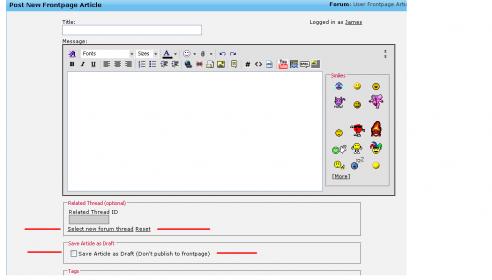 --------------------------- Here's how to use it. In the Quick Links menu at the top of the forum select Post Frontpage article. You will be presented with a page similar to posting a new thread. Simply post a thread in the normal way with a subject and message. Attachment 2478 To select a related thread (thread on the forum which is about the same subject) click 'Select new forum thread'. This is optional though, if you don't select a thread a new notification thread will be posted on the forum. Mods can merge that with another topic if need be so don't worry. And to Save a draft article click 'Save Article as Draft (Don't publish to frontpage)' Click Submit New Thread as usual and wait for the article to be approved. (we'll give reporter status to users also so they can post articles without waiting for approval). Guidelines for articles are: