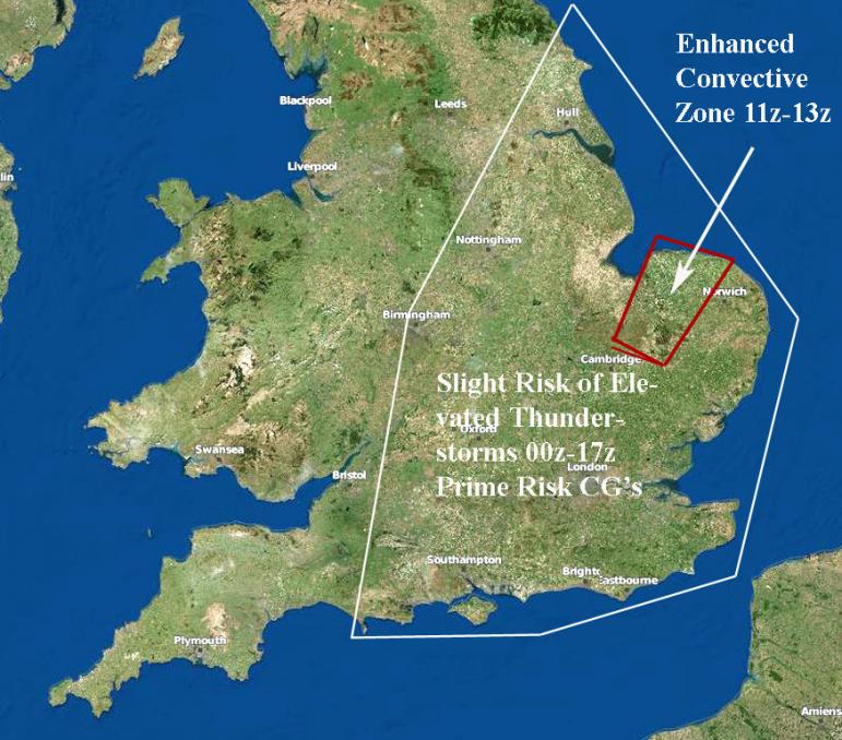 Scattered thunderstorms are likely to extend northwards across eastern and southeastern areas of England during Friday giving some localised intense downpours. The public should be aware of the risk of localised surface water flooding which may lead to disruption to transport and outdoor activities. Frequent lightning could prove to be an additional hazard. |