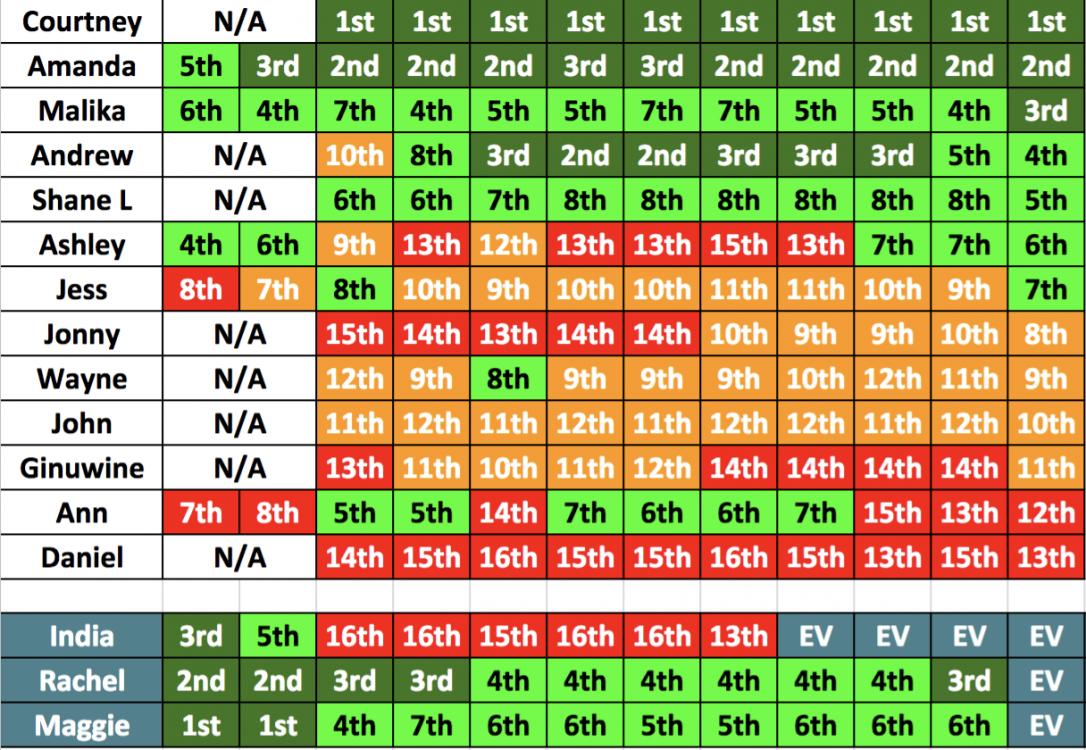 2. Rachel 3. Amanda 4. Wayne (+2) 5. Ann 6. Maggie (+3) 7. John 8. Shane L 9. Shane J (+2) 10. Malika (-6) 11. Ashley (-1) 12. Jonny (+1) 13. Ginuwine (-1) 14. Andrew 15. Daniel |
