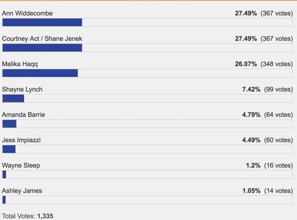 Courtney Act / Shane Jenek 27.44% (366 votes) Malika Haqq 26.09% (348 votes) Shayne Lynch 7.42% (99 votes) Amanda Barrie 4.8% (64 votes) Jess Impiazzi 4.5% (60 votes) Wayne Sleep 1.2% (16 votes) Ashley James 1.04% (14 votes) Total Votes: 1,334 Return To Poll |