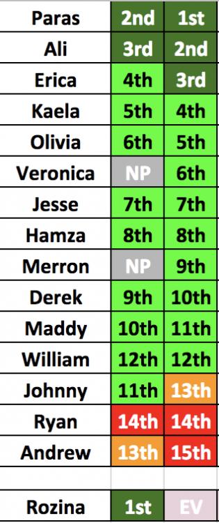 1. Paras (-) 2. Hamza (+2) 3. Ali (-1) 4. Derek (+2) 5. Jesse (+2) 6. Will (+2) 7. Kaela (-2) 8. Veronica (+1) 9. Merron (+2) 10. Maddy (-) 11. Erica (+3) 12. Johnny (-) 13. Olivia (-) 14. Andrew (+1) 15. Ryan (+1)