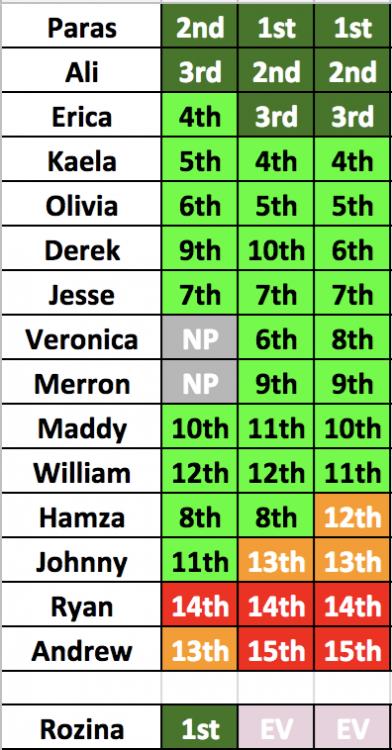 1. Veronica 2. Erica 3. Will 4. Paras 5. Alejandra 6. Johnny 7. Maddy 8. Jesse 9. Merron 10. Derek 11. Olivia 12. Kaela 13. Hamza 14. Ryan 5-11 are all pretty much interchangeable.  |