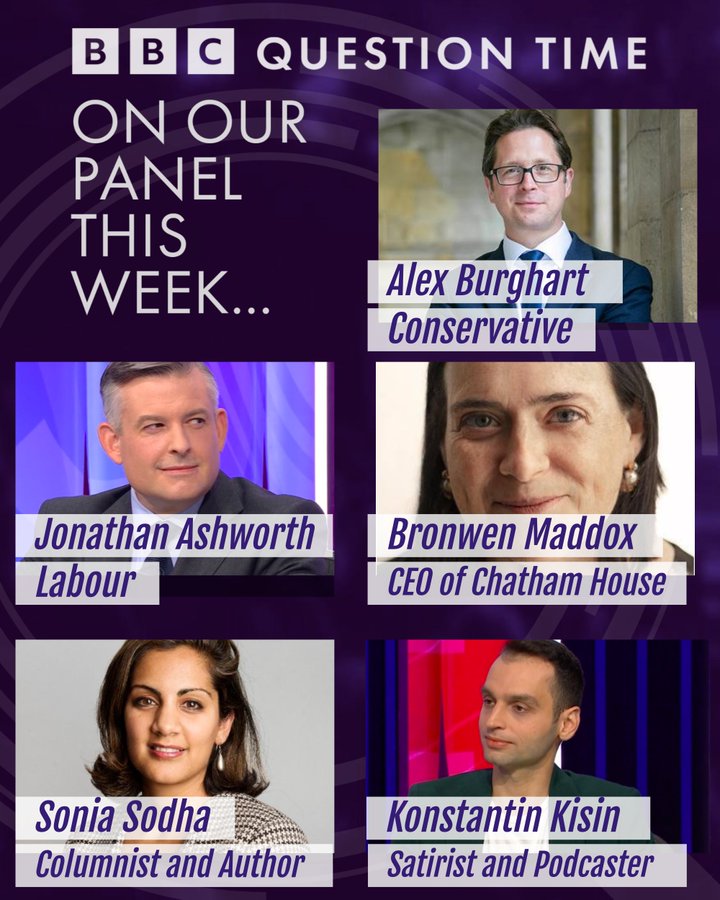 It was pretty dire in my view. The only thing I've been surprised by on QT in recent months us the regular criticism of the Rwanda policy of the government. No matter where they are in the UK,Labour or Con areas, there's rarely more than one of a small few who support the policy. QT has lost its way badly and sadly Fiona Bruce doesn't keep to the content of questions asked. |