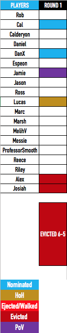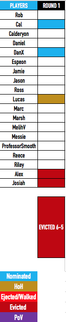 Well done to Dan X and Cal considerations to Josiah and Alex I'm afraid I voted to evict you both so I'm not upset. Bring on the next HoH - Riley's Revenge!