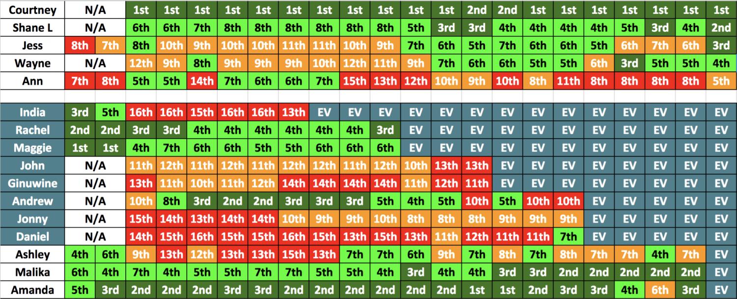 2) Jess (-1) 3) Courtney (+1) 4) Ann (+3) 5) Shane (+3)
