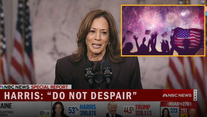 While Americans of all ages, races, and socioeconomic backgrounds continued to joyously celebrate Trump's return to power, Harris pleaded with everyone not to give in to any feelings of sorrow and heartbreak. |