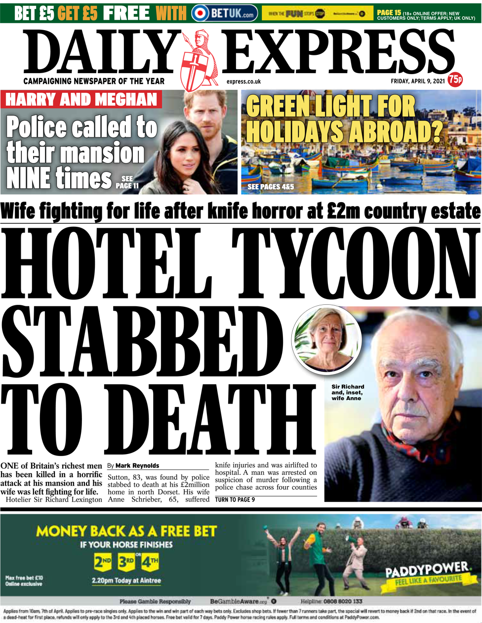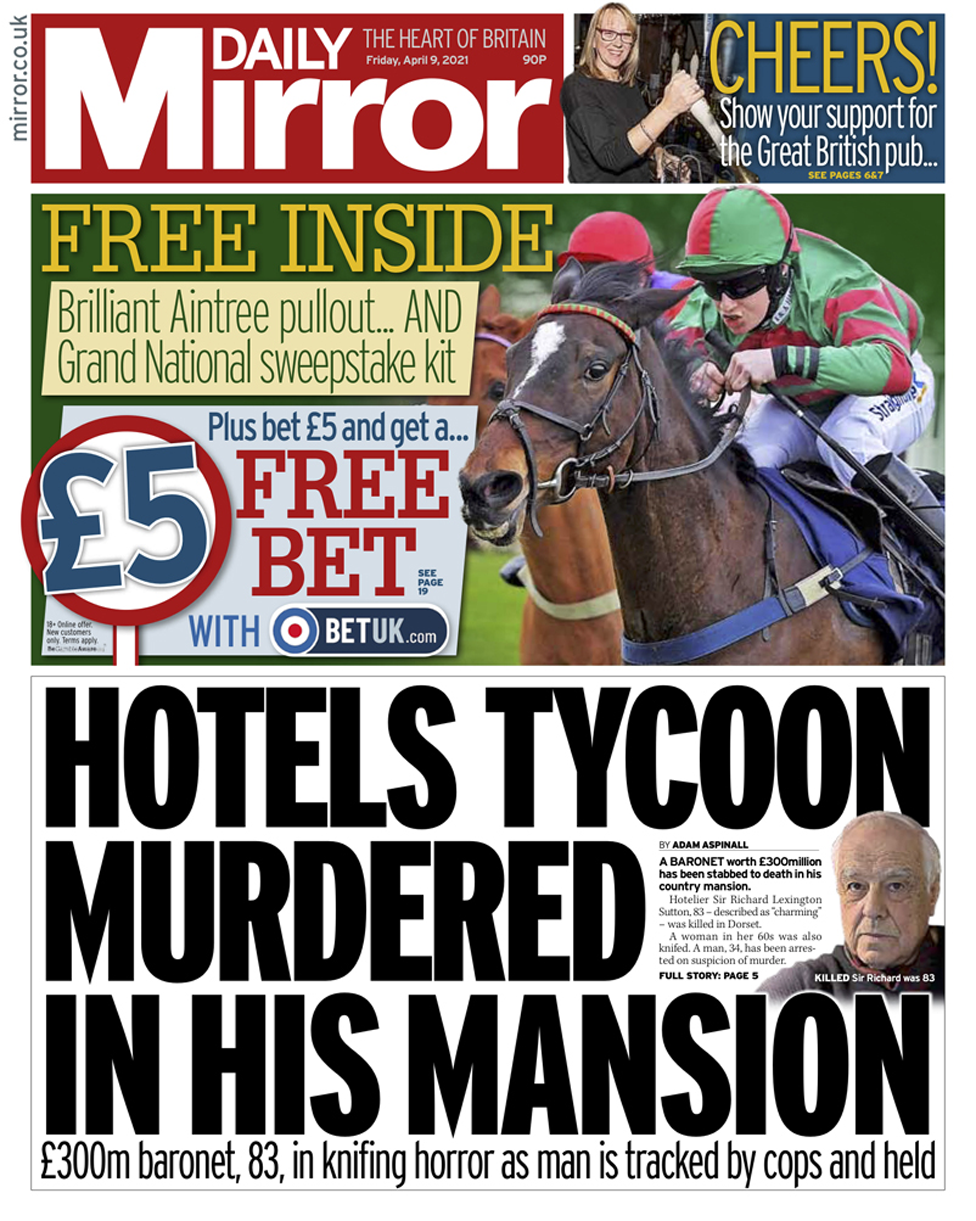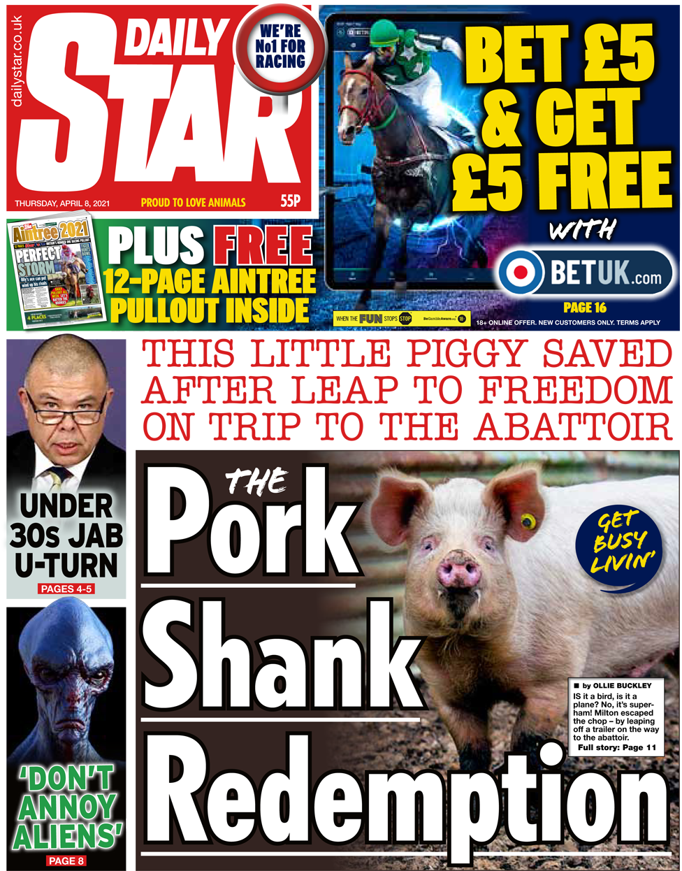 ![]() BBC Text: [Daily Star's main story is the tale of a pig called Milton who "escaped the chop" by leaping off a trailer while on his way to the abattoir. After they found the runaway pig, his owners - a family in Devon - decided to keep him. "He's become quite a famous pig over the last 24 hours," his owner said.] |