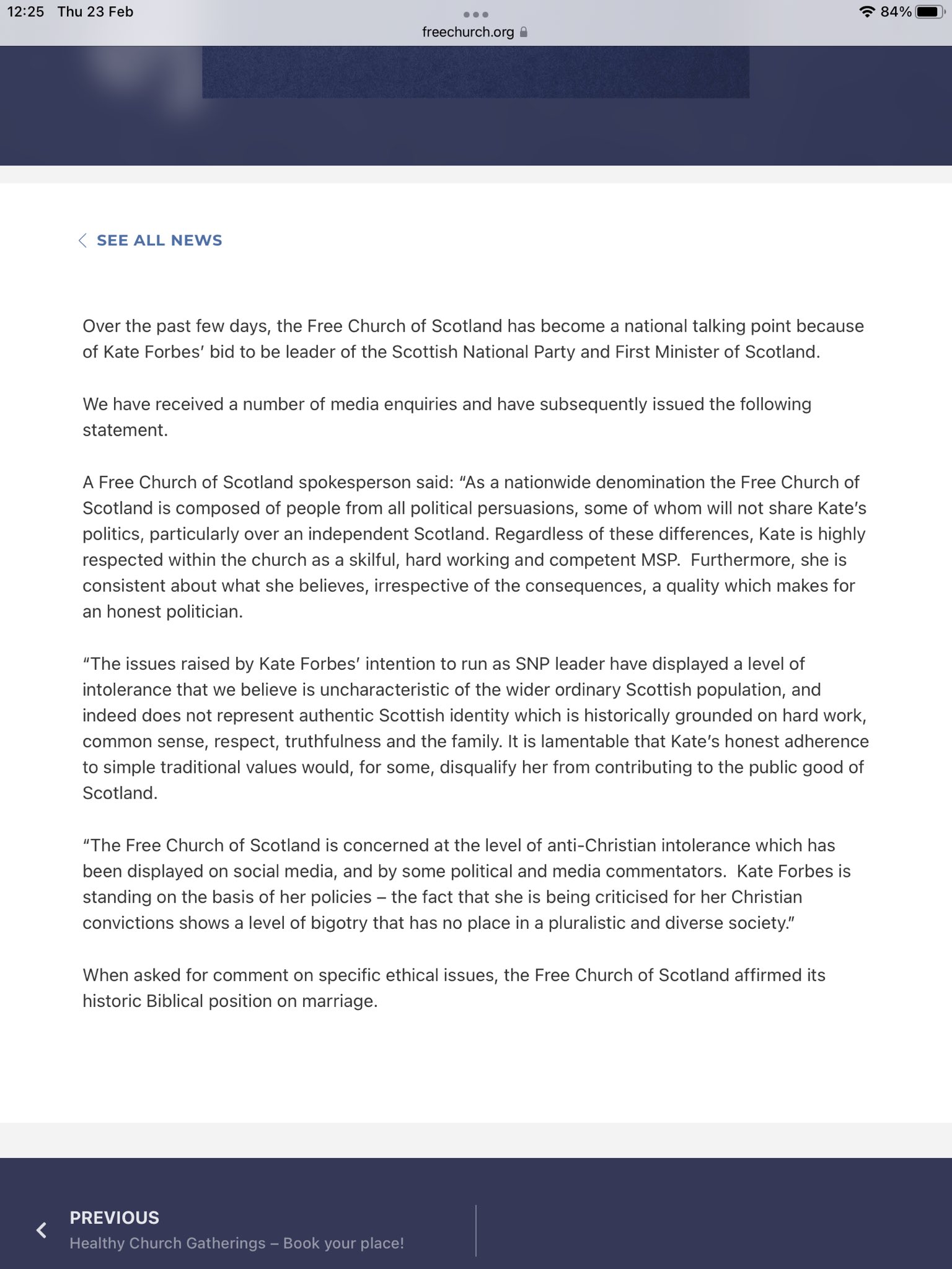 Does Kate Forbes’s personal faith preclude her from leading her party or her country? The commonly accepted view – of Scotland’s politicians, at least – seems to be that it does. In response to a question on how she would have voted on gay marriage had she been an MSP at the time, Forbes said, with punishing honesty, “against”. It triggered an outpouring of carefully choreographed outrage from both supporters and opponents. Add to the charge sheet her opposition to abortion and to self-ID for trans people and you have the perfect hate figure for these woke times. Yet demands for Forbes to withdraw from the race to succeed Nicola Sturgeon as SNP leader and Scotland’s First Minister are missing the point of what representative government is actually about. A large minority of Scots are Roman Catholics, and a significant proportion of them, as well as followers of many protestant faiths, will sympathise with Forbes’s views on abortion and even same-sex marriage. Polls have already established that it is Sturgeon and the Scottish Parliament, in pressing ahead with gender recognition reform, who were out of step with the public they represented. But such facts are inconvenient for our politicians, who prefer to believe that society has been recast in their own image. It is they, not Forbes, who risk making Scotland an international, intolerant embarrassment. Scotland, just like the rest of the country, is more complex than its leaders would have us believe. It is a collection of people with diverse and opposing views, even on those issues that MSPs regard as sacrosanct. It can be easily forgotten that when Westminster, closely followed by Holyrood, legislated for same sex marriage, there was actually a debate. There were votes, with large numbers of MPs voting against. MPs received hundreds of letters from constituents imploring us to oppose the legislation; sent not by demented extremists living in survivalist cults, but from ordinary men and women – respectable, polite, thoughtful, concerned. It’s likely that a few of those letter-writers have since changed their minds, given that same-sex marriages has led neither to the apocalypse nor to the general collapse of society. Many will have remained irreconciled to this particular reform. That doesn’t make them monsters or homophobes; it makes them a minority with the right to express a view. Isn’t democracy about allowing contrary opinions to be freely expressed? There is nothing in Kate Forbes’s recent comments to suggest she is remotely inclined to revisit the issue of equal marriage: she merely stated that had she been an MSP at the time her faith would have compelled her to oppose the legislation. As a democrat she would also have accepted the final vote, just as she accepts that gay couples today can get married if they choose. Ironically, Forbes’s stance is more liberal than that of her detractors who are now revealing that their own, much-vaunted tolerance for other people stops short of tolerating a politician with different views to their own. The finance secretary’s abilities, her talent, her impressive rise through the ranks, even her potential to appeal to voters outside the SNP’s traditional orbit – a skill that one assumed would be considered gold dust in these difficult times for the nationalist movement – are of no value when placed next to the accusation that she holds opinions on some cultural issues which are shared by many, many Scots. We’ve been down this path before, leaving many political careers by the wayside. Tim Farron, as leader of the Liberal Democrats, proved that it was nigh impossible for an evangelical Christian to lead a major political party when he was plagued by questions as to whether homosexual sex was a “sin” (a concept that was alien even to his interrogators). Sixty years ago, in the United States, John F Kennedy was considered by many to be unfit for the office of the presidency because of his Catholic faith: he would inevitably owe his loyalty to the Vatican, not the constitution, they erroneously claimed. Given the chance, Scotland’s voters would judge Forbes’s leadership on her stewardship of the Scottish Parliament’s key functions, not on her personal faith. Because ordinary members of the public either hold, or know other people who hold, the same views as Kate Forbes. And because they are rather more in tune with reality than their politicians, they see no threat to anyone’s civil liberties or rights as a consequence of those views. https://www.msn.com/en-gb/news/other...258af48d874271 Good summation of the situation,, I don't agree with some of her views specfically on gay marriage and abortion but she is entitled to her views as she sees them I always find it odd that only some people of faith are questioned about their stances on these issues while others slide away scot free.....pun intended
