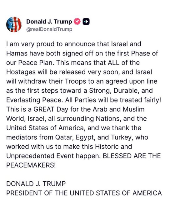There are only around 20 hostages alive so the rest will be going home in boxes having been beaten, raped, starved, deprived of water, made to dig their own graves... But I am thankful that they will be going home to their families. In return, Israel will be releasing thousands of Hamas supporters including a couple of hundred who are serving life sentences. Fair? The thing that does give me hope is that it's expected that Hamas has, or shortly will, agree to take no further part in the running of Palestine. The billions that have been poured into Gaza over the last couple of decades has been spent by Hamas on arms and digging tunnels. The people of Palestine could be living high on the hog right now rather than the squalor many have endured before the war, and the devastation they've endured since Hamas attacked Israel 2 years ago.