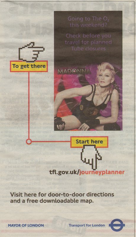 The London edition of UK newspaper the Metro published this advert on their travel page yesterday - advising fans to check travel arrangements before heading off to the O2 arena this weekend. ![]() http://madonnalicious.typepad.com/ma...ess-metro.html |