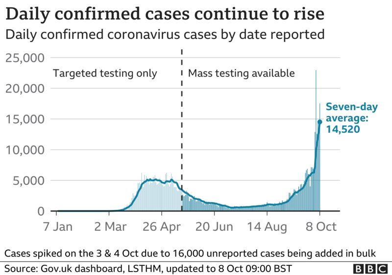 Covid Symptom Study app data also shows UK cases are rising, but at a slower pace than in early September. The figures come as the government in England grapples with how to introduce new restrictions. Science advisers warn hospital admissions are "very close" to levels in early March. Ministers say cases are "getting out of control". The ONS estimates, which go up to 1 October, that 17,200 people a day are being infected in homes in England, with the highest rates in the North East, North West and Yorkshire and The Humber. The organisation estimates that one in 500 people are infected in Wales and Northern Ireland. The Covid Symptom Study app - which uses data from 4 million people and 12,000 swab tests - estimates 21,903 people are developing Covid symptoms every day across the UK. That is 1,000-a-day more than a week ago. Prof Tim Spector, who led the analysis at King's College London, said: "We aren't out of the woods yet, especially as hospital admissions are starting to increase, which we predict will continue to do so over the next two weeks." The rise in cases and people being admitted to hospital is causing mounting concern. New rules are expected to be announced on Monday and come into force on Wednesday. The precise details are still being debated, but could include closing pubs and restaurants or a ban on overnight stays in some areas. Data presented to MPs by England's chief medical officer, Prof Chris Whitty, appears to put the hospitality sector in the firing line as parts of society such as schools and universities are being kept open. https://www.bbc.co.uk/news/health-54477618 Last edited by bots; 09-10-2020 at 11:55 AM. |