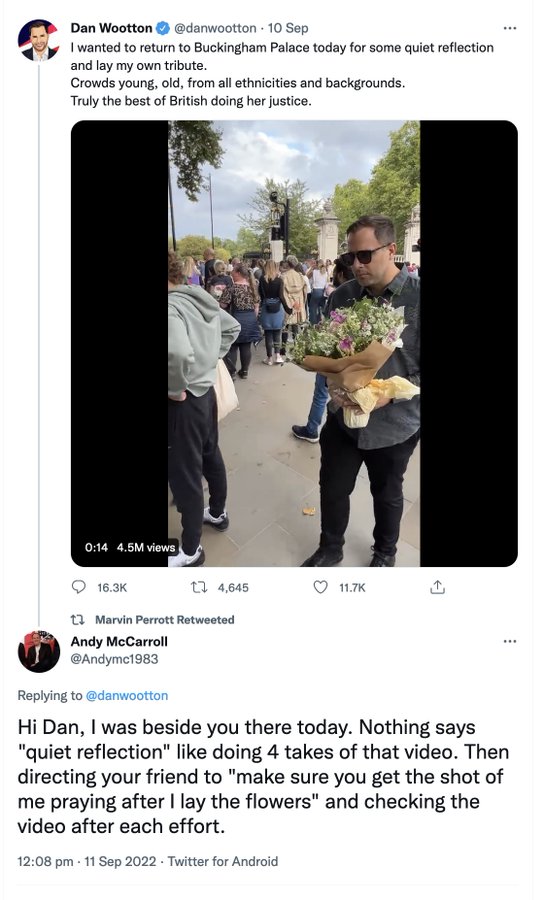 Again this just shows what a vile narcissist he is . He still made it about himself ,and he still used The Queen's death for his vulture platform.