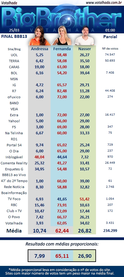 BBB 1 - 59 Points BBB 2 - 45 Points BBB 3 - 55 Points BBB 4 - 56 Points BBB 5 - 57 Points BBB 6 - 51 Points BBB 7 - 48 Points BBB 8 - 46 Points BBB 9 - 41 Points BBB 10 - 40 Points BBB 11 - 30 Points BBB 12 - 26 Points BBB 13 - 29 Points -- 51% Share Each point means 62,000 TV in the metropolitan region of Săo Paulo or 177,000 people Big Brother Brazil 14 starts in January next year !