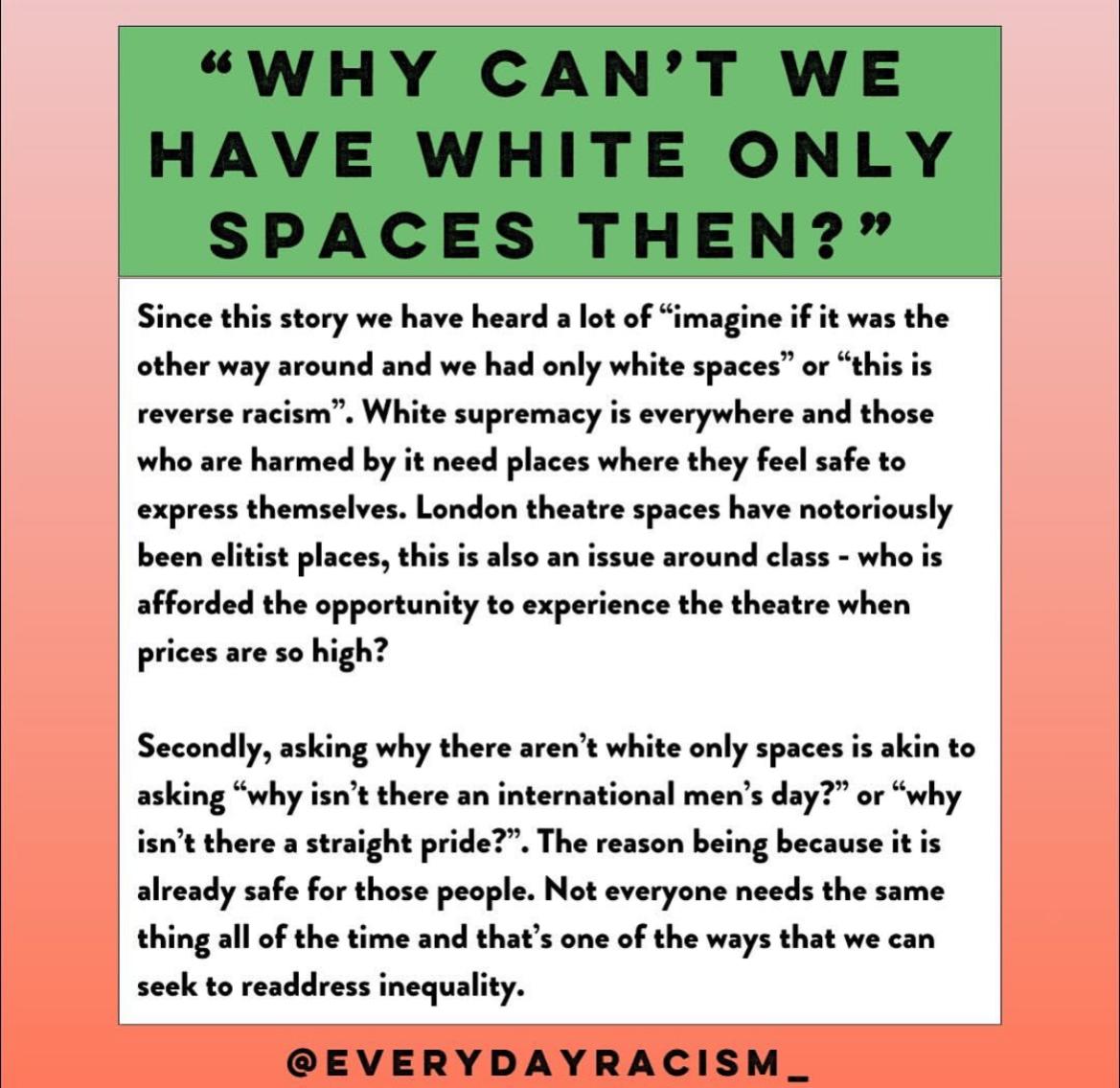 I find it disturbing that a theatre can attempt to welcome only black people to a performance while at the same time casting black actors in roles clearly meant to be white characters. I saw a film recently where a black Guardsman was cast in Victorian times. The first black man entered the Guards in the 1986 and he had a bloody awful time. Pretending that there were black Guardsmen in Victoria's era is not only an insult to what he went through, it makes unthinking people imagine that it was true and everything was fine back then when the very reverse is true. For some people films will be the only history they ever get. I wonder why black people put up with it and don't demand that their history is not distorted. Casting black actors as members of English society in history is ridiculous, just as ridiculous as casting a Jew or a working class person. You can't have a discussion about this though, or you're racist.