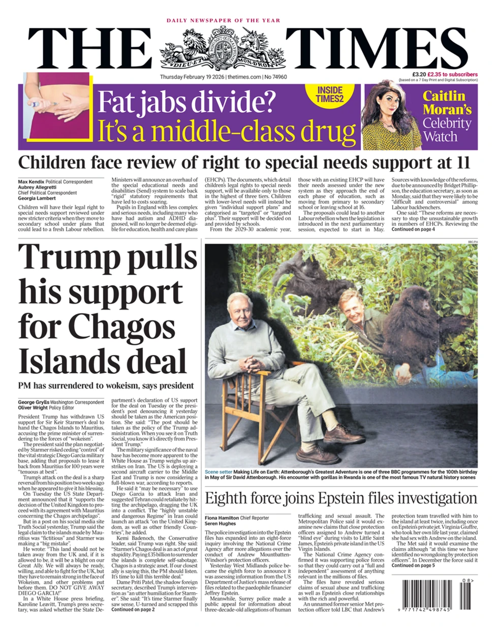 [Donald Trump's change in stance after a fresh attack on the Chagos Islands deal. The US President has demanded Sir Keir "not give away" Diego Garcia to Mauritius and added the military base was crucial for possible airstrikes on Iran, the paper reports.]