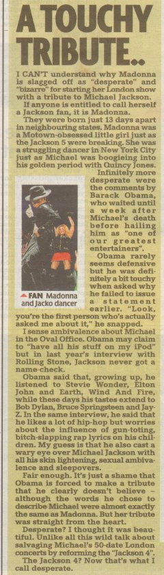 UK newspaper columnist Tony Parsons stands up for Madonna's decision to pay tribute to Michael Jackson in her concert. ![]() http://madonnalicious.typepad.com/ma...-mirror-1.html |