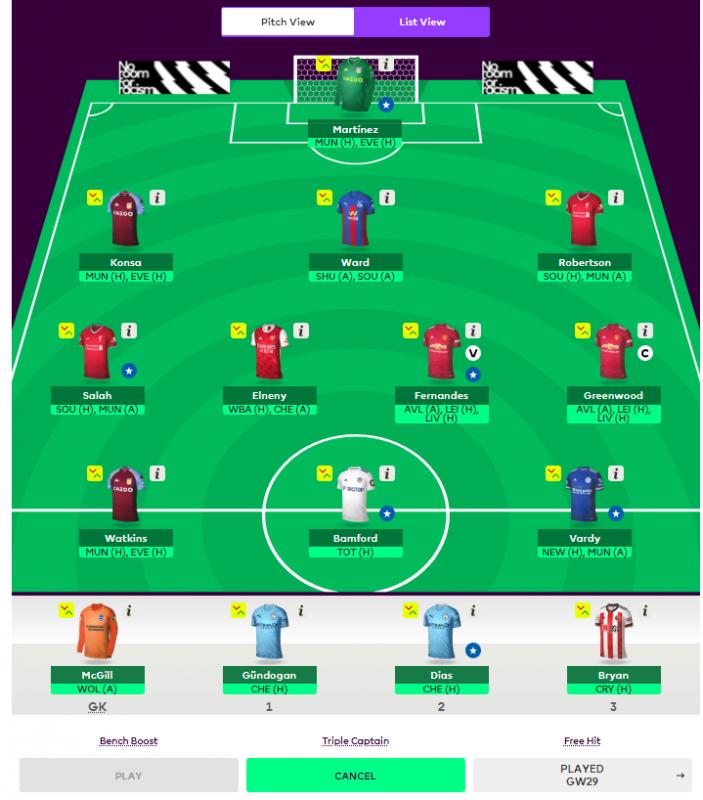 Did not go Fernandes, did not go Rashford, went with Greenwood and Pogba(!?) who are both gone come next week. Only because of Kane. Also went with Watkins instead of DCL. Last edited by Calderyon; 07-05-2021 at 06:02 PM. |