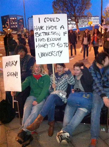 ![]() I would point out that it was the CONSERVATIVES won the last election NOT the LIB-DEMS, and the coalition is merely a marriage of convenience. Personally, I would have preferred the Conservatives to form a government without hindrance from a wishy washy party like the Lib-Dems (just Labour in a different form). It was the hypocritical LABOUR party that introduced fees in the first place, and used their 13 years in power to mortgage this country for the next couple of generations at least, so put the blame where it deserves to be. Students are like a bunch of spoilt brats throwing their toys out of the pram because they can't get what they want. How about all the poor sods who have been made redundant or are subjected to wage freezes and are struggling to bring up families in this recession? What would happen if we all went on the rampage? What exactly would it achieve? Going to University is a lifestyle choice and students should not expect others to fund it. They have already had free education up to the age of 19 which, sad to say, evidenced by some of the posts on this forum, has had little impact on some members' grammatical, spelling,mathematical and logic skills. As to stereotyping students, I haven't done that, they've managed it all by themselves by their appalling and unreasonable behaviour. There is also a degree of arrogance on their part since they believe themselves to be more deserving of funding than other members of society who are struggling to cope in this recession. Well they are not. I had to leave school at 16 because I had to help to contribute to my family's finances, but I joined the Open University later on in life and achieved two degrees, a BA(Hons) and a BSc(Hons) as well as several diplomas, whilst being a single parent, bringing up two children and WORKING FULL TIME. I did NOT expect anyone else to pick up the tab because I had CHOSEN further study. I have no problem with further education, but why expect someone else to pay for it? I note that a lot of your concern is about the fact that English students might start looking to go to Scottish universities, thereby reducing the number of places available to Scottish students! Welcome to our world here south of the border where the world and his wife clamour for scarce resources on every front: housing, schools, doctors, dentists, jobs etc etc. That's life, and students would do well to keep in mind what they are supposed to be preparing themselves for.