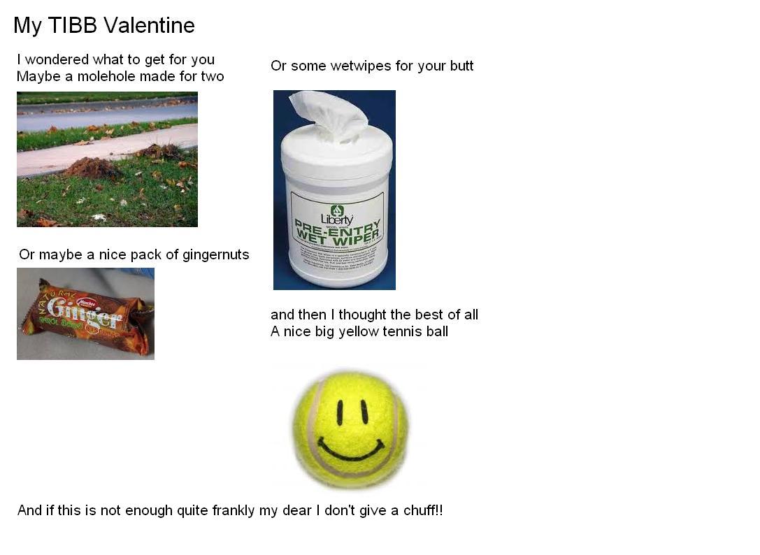 Anyone else who still wants to take part can do so, just pick someone from Tibb to give a non secret gift to and post it in here tomorrow, maybe let them know, so they don't miss seeing it. It can be humorous or downright silly, whatever you wish. Just a bit of fun.