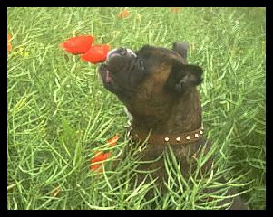 Cracker - Boxer Dog. Eating a poppy.