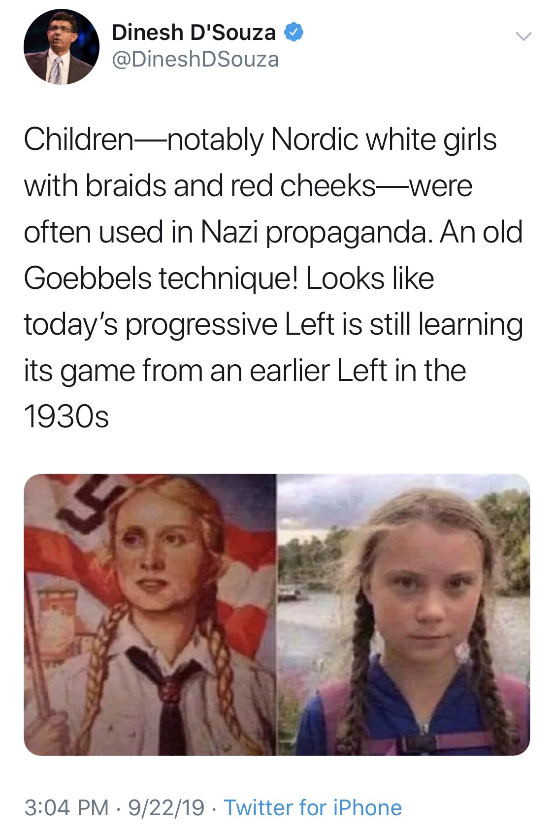 In the nazi propaganda the youth wing were not educated they were forced into believing the lies from the party. Greta is affiliated to no party. The depiction was a party inspired image of the perfect child...not an actual child. Greta is an actual child. The nazi propaganda spoke against experts and unity and called for the suffering if others. Greta calls for those in power to listen to scientists and experts, she speaks of unity and an end to the suffering of others. The message could not be more different, so why would anyone think for a moment the outcome will be the same? There is no call to usurp, suppress, repress or kill, apart from the pigtails there is nothing to link these whatsoever. If that is enough for you to disregard her and her message then that is pitiful and for me a sign that it is not Greta who has been indoctrinated.