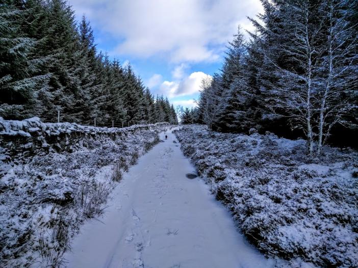 I had to nip to the garage first thing today, our local garage is 1000 feet above sea level high above the town so it was a wee bit snowy geting up there. I was able to take the hound up into the forest for a lovely walk, it was around -4C but there was little wind so not cold at all.