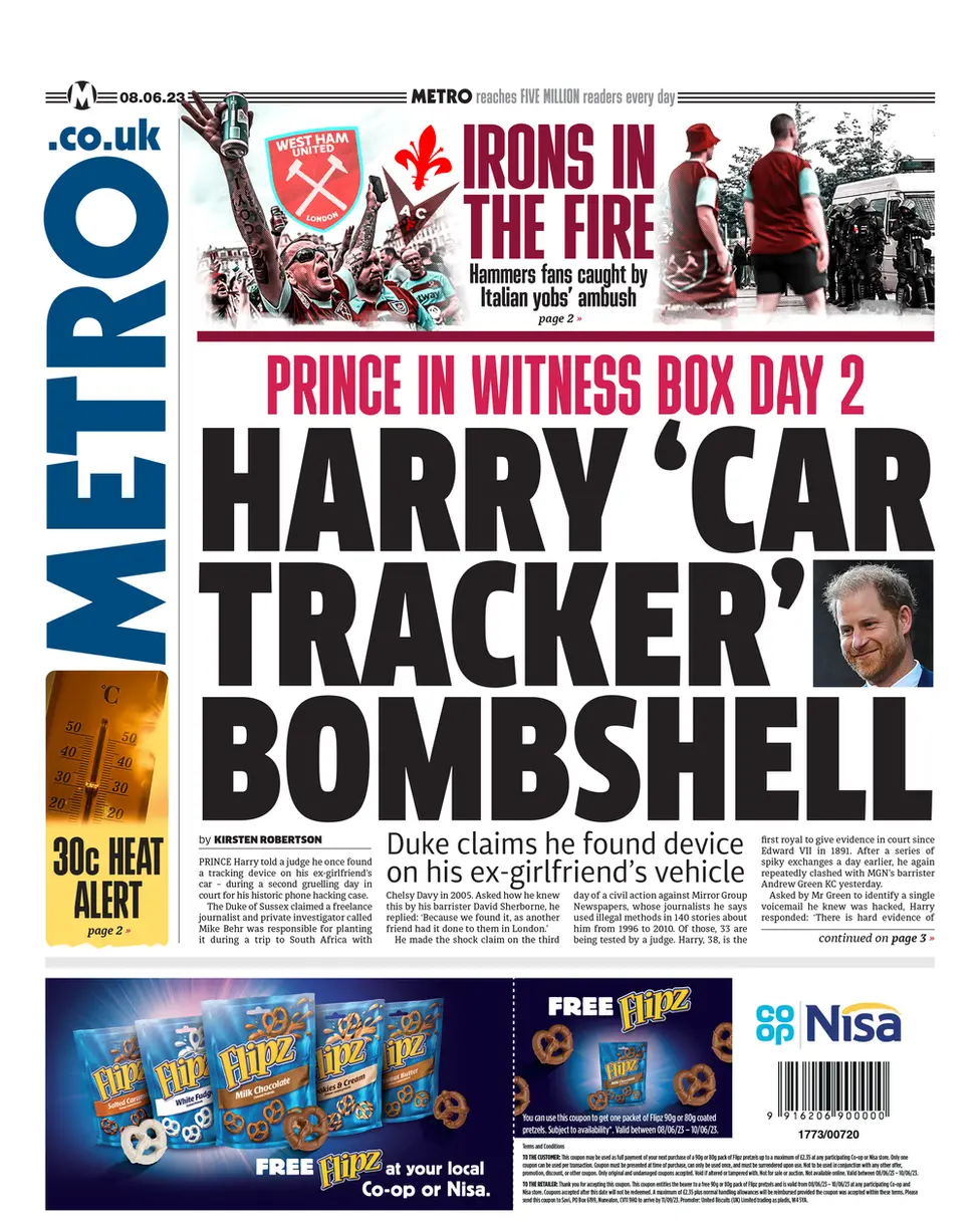 [Prince Harry's second day in the witness box for his historic phone hacking case. The paper focuses on his claim that he found a device on his ex-girlfriend Chelsy Davy's car in 2005.]