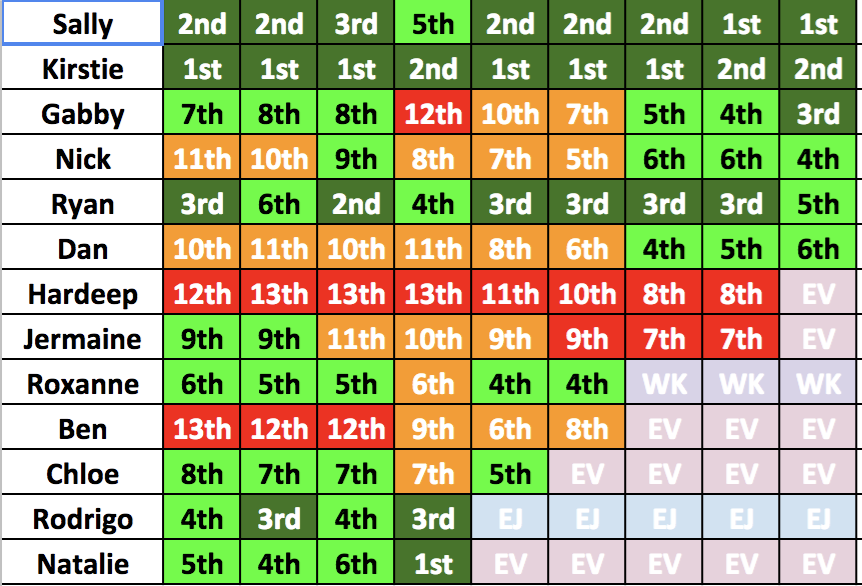 2) Sally 3) Chloe 4) Rodrigo 5) Roxanne 6) Kirstie 7) Nick 8) Hardeep 9) Ryan 10) Gabby 11) Ben 12) Dan 13) Jermaine