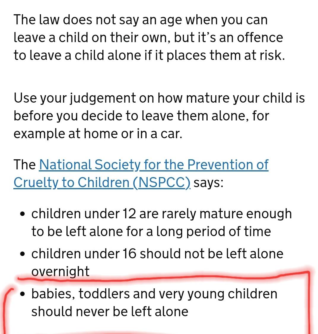 So it's not illegal to leave a child alone but it is an offence if they are at risk, the very bottom part of the screenshot clearly states what most people know anyway. Not sure how anyone can try to justify that as being a normal or common thing for parents to do