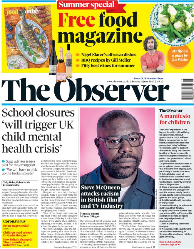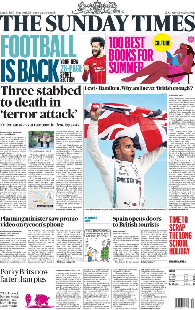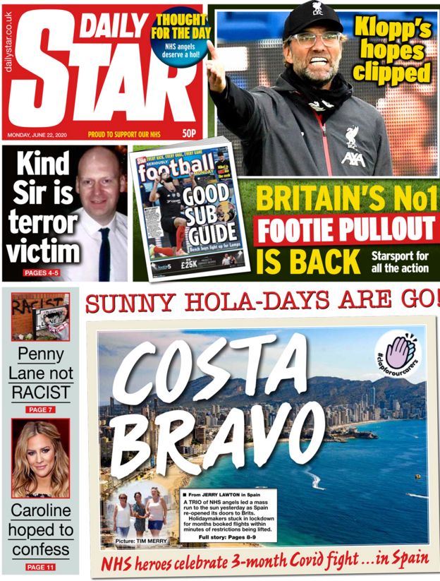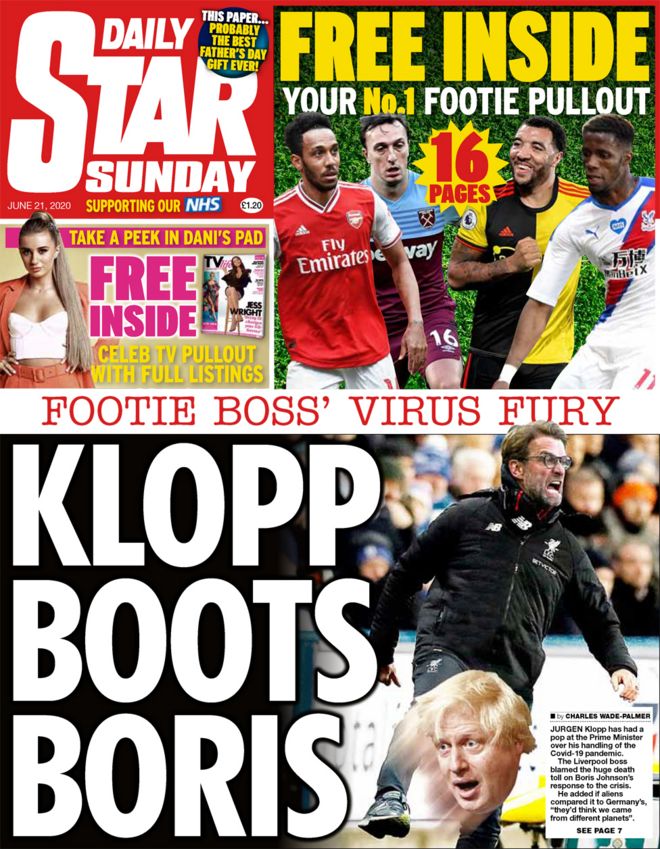 ![]() [BBC Text: Klopp boots Boris," is the lead story on the front page of the Daily Star Sunday, as the paper reports on the criticism from the Liverpool football boss over the PM's handling of the coronavirus pandemic. Jurgen Klopp said that if aliens compared the UK's handling of the crisis to Germany's "they'd think we came from different planets", the paper reports.] |