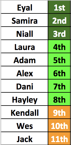 1. Samira 2. Eyal 3. Laura 4. Hayley 5. Adam 6. Dani 7. Kendall 8. Niall 9. Jack 10. Wes 11. Alex