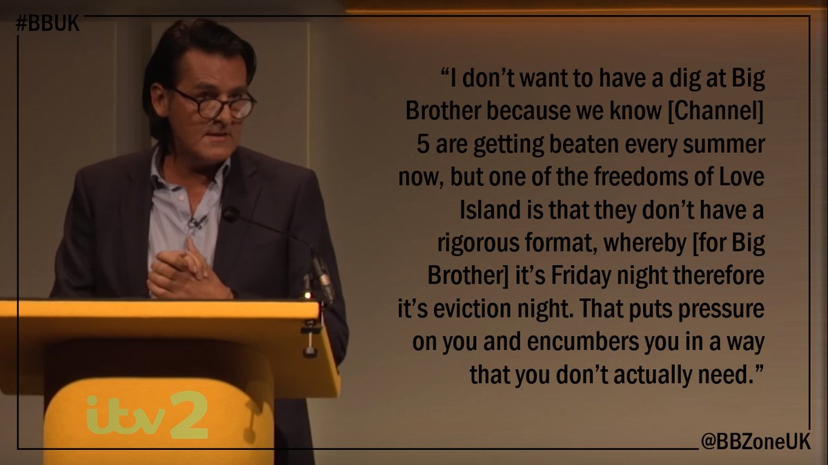 I mean how can he explain Love Island beating BB in ratings over the Friday eviction and scheduling? Is he living in the 90's? People don't stay in to watch a live eviction which is apparent these day's seeing as its one of the lowest rated episodes (in live terms) each week they record it and have some very impressive figures when it comes to catch up.