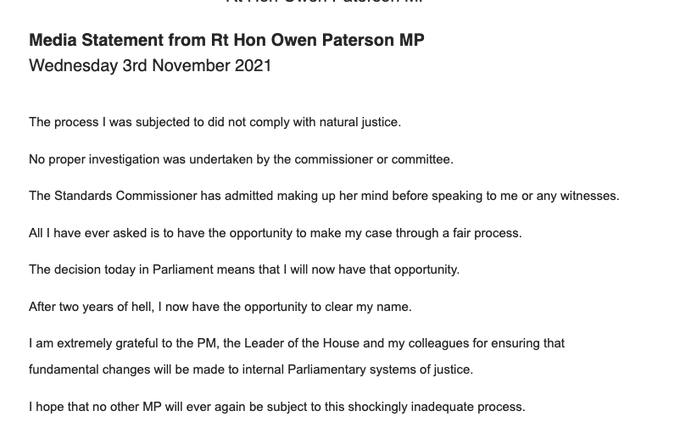 "repeatedly used his privileged position" to benefit Randox, a clinical diagnostics company, and Lynn's Country Foods, a meat processor and distributor and has been recommended for suspension from the Commons for a month. The MP, who was environment secretary from 2012 to 2014, was a paid consultant for Randox from 2015 and for Lynn's Country Foods from 2016. The allegations relate to his conduct between October 2016 and February 2020.] He claims it was not a Proper Investigation and he was saving lives? But Rules are bloody rules Some state this should mean a By Election must be called? https://news.sky.com/story/owen-pate...anies-12444841 Ref: All Out Politics SkyNewsHD, Politics Live BBC2HD Last edited by arista; 28-11-2021 at 11:02 AM. |