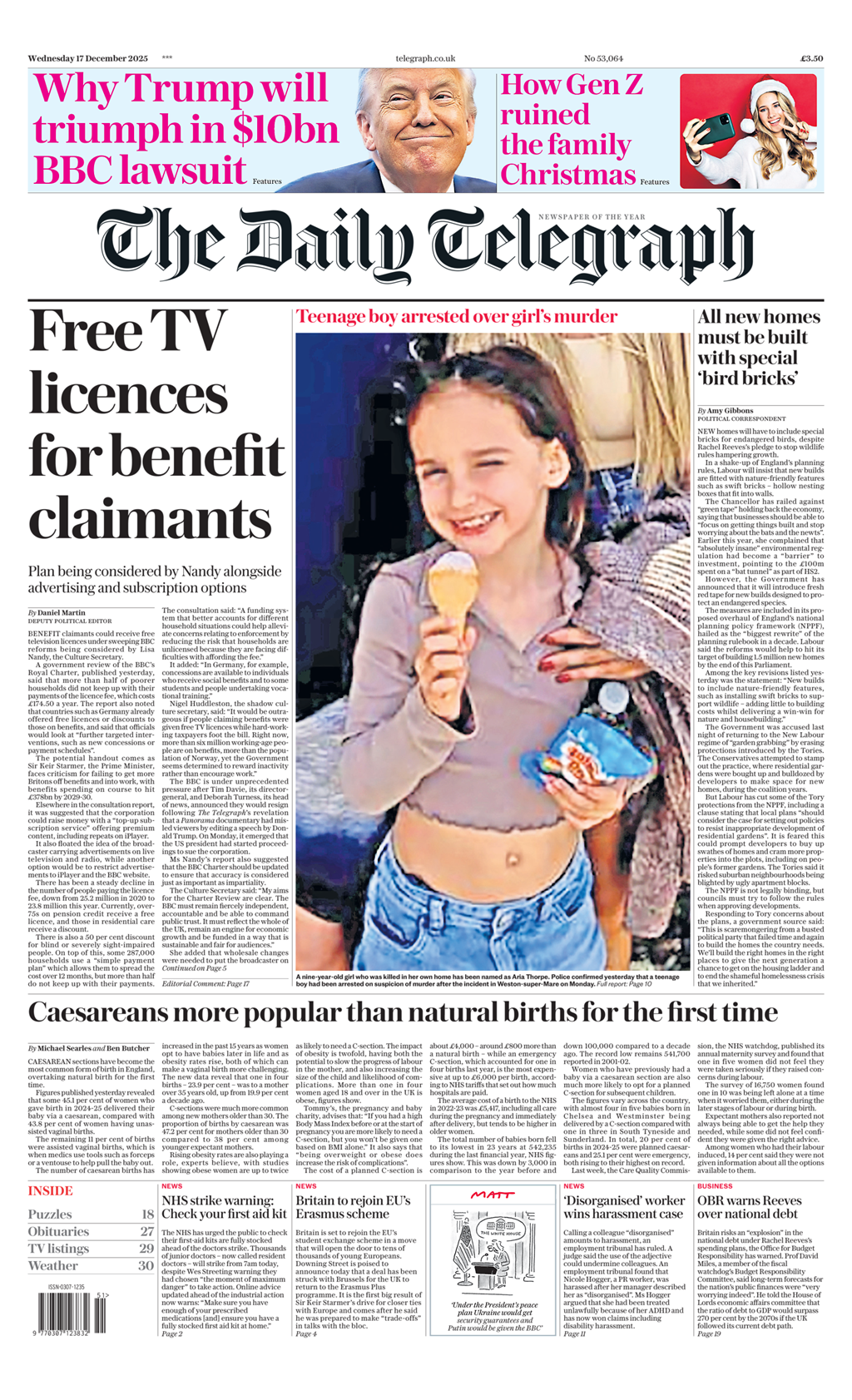 [Benefit claimants could receive free TV licences under sweeping BBC reforms being considered by Culture Secretary Lisa Nandy, The Daily Telegraph reports.] ![]() Sky News Text: [Middle-class families face paying more to watch the BBC to help fund free licences for benefit claimants, the Daily Mail reports.]