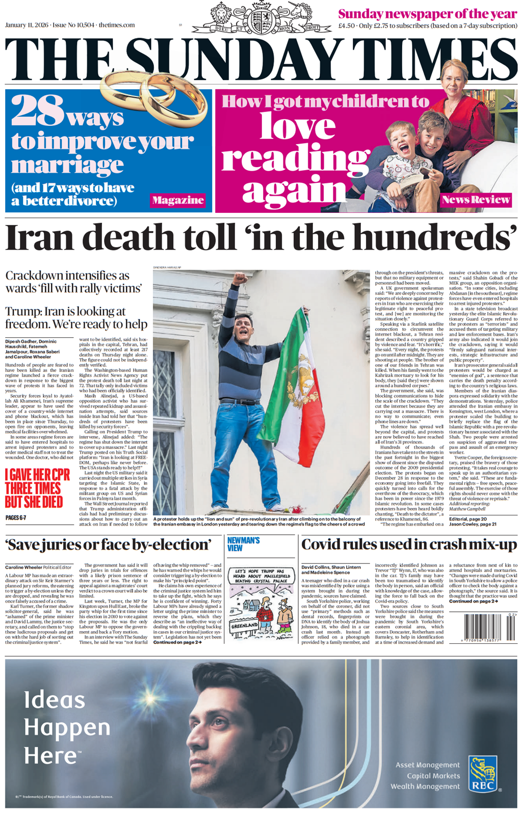 ["Tehran hardens crackdown on protesters 'working for Trump'" reads the weekend edition of the Financial Times. Iranian officials have said that protesters will receive the maximum punishment, with diplomats concerned that the "cover of the internet blackout" could be used to suppress the demonstrations. The paper says that the protests "present the biggest domestic threat to the regime in several years".]