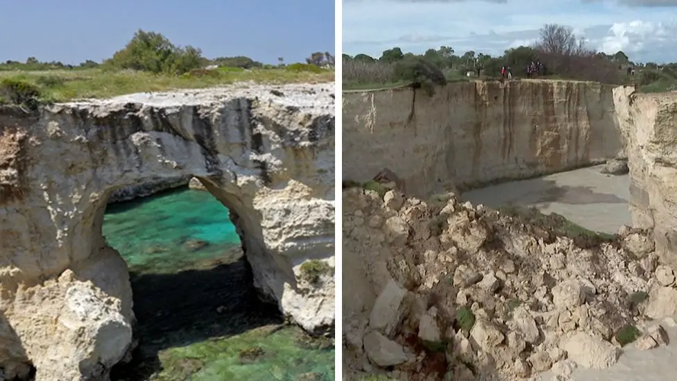 ![]() A famous rock structure in Italy dubbed "Lovers' Arch" collapsed on Valentine's Day after days of heavy rain and strong winds. The rock formation at Sant'Andrea in Melendugno, Puglia served as a tourist attraction for wedding proposals and was a popular landmark on the Adriatic coast. "This is an unwanted Valentine's Day gift", Melendugno Mayor Maurizio Cisternino told local media. He said it was "a very hard blow" for the region and for tourism. "Nature as it created the bow, has taken it back", he added. Passers-by first noticed the absence of the natural landmark on Sunday morning. Officials have suggested severe weather brought by a storm named Oriana - which has battered southern Italy in recent days - accelerated the rock's erosion, causing its collapse. "We have lost one of our region's defining characteristics, a symbolic asset," Puglia's regional president Antonio Decaro told reporters at the site on Monday. "Unfortunately, natural processes are often accelerated by meteorological phenomena, such as the tail end of storm Oriana", he said. Decaro said authorities needed to concentrate on attempting to slow coastal erosion and preserving the coast. The Salento region, where the arch was located, is one of Italy's most popular tourist areas. https://www.bbc.co.uk/news/articles/cpd8elz20jpo |