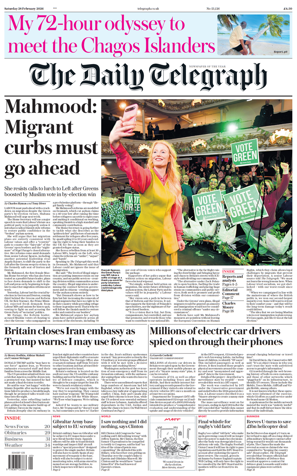 [The home secretary believes Labour should press on with reforming the UK's asylum system, despite the party's by-election defeat in Gorton and Denton. The newspaper reports that Shabana Mahmood will make her case for tougher migration rules during a speech next week.]